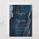 Cette élégante invitation de mariage présente une image arrière - plan d'agate bleu marine d'aquarelle ornée d'une parties scintillant d'or rose. Le texte personnalisable combine écriture rose rose moderne, cuivre et polices italiques. L'envers présente un design coordonné d'agate en or bleu marine et rose. L'envers offre de l'espace pour les détails mariages sur un arrière - plan d'agate bleu marine correspondant, ainsi qu'un code QR que les invités peuvent scanner pour visiter votre site Web et RSVP, ce qui permet d'économiser le coût d'impression et d'envoi de cartes RSVP séparées.