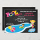 Commencez votre célébration outre de la droite avec cette invitation adorable. Perfectionnez pour la réception au bord de la piscine de cette fille d'anniversaire. Il a un arrière - plan noir de tableau. Il y a une grande piscine avec une fille adorable et mignonne se tenant à côté de la piscine dans un magma de l'eau. Elle a des cheveux blonds et un maillot de bain de roses indien. Dans la piscine est une fille d'une chevelure blonde mignonne flottant dans un radeau. À côté de elle est une fille d'une chevelure brune adorable flottant autour sur un tube vert de point de polka. À travers le dessus de l'invitation est la réception au bord de la piscine de mot. Les deux o dans la piscine sont les tubes colorés. Vérifiez les nombreux autres produits et conceptions dans cette ligne de réception au bord de la piscine. illustrations de ©JW