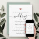 Cette faire-part de mariage chic brille avec simplicité. Typographie moderne, calligraphie magnifique accentuée par un joli coeur en or rose (imprimé), cette suite est à la fois minimaliste et élégante. Espace pour plus de détails sur le dos (ou laisser vide). Il s'agit de la version arrière - plan couleur vert sauge poussiéreuse - la couleur est facilement personnalisée dans l'outil de conception sous "customiser plus loin".