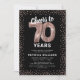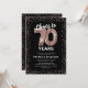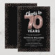 Élégante invitation de fête de soixante-dixième anniversaire avec un fond noir stylé qui peut être changé en n'importe quelle couleur, paillettes rose gold scintillantes, soixante-dix ballons en hélium rose gold et un modèle de texte de célébration de 70e anniversaire moderne facile à personnaliser.