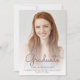 Faire-part moderne branché avec photo verticale personnalisée. Le mot "Graduate" apparaît dans la superposition du script d'écriture rose foncé, avec le nom du diplômé, l'école et l'année de graduation ci-dessous en sans serif police. Remplacez facilement l'image de l'échantillon par la photo de votre diplômé. Un écran de dégradé blanc permet de s'assurer que le texte s'affiche. Ajoutez des détails sur les réalisations de votre diplômé et les plans d'avenir à l'envers, qui comprend une bordure en faux parties scintillant en or rose sur un arrière - plan sombre.