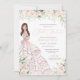 Elégant design de luxe avec des roses douces rose et blanche, des accents d'or rose, et une belle poupée dans une luxueuse robe de bal fleurie. Tout le texte est entièrement personnalisable.