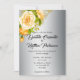 Une belle invitation de mariage dorée à fleurs et argent, avec un bouquet de magnifiques roses jaunes dans le coin supérieur gauche, sur une base métallique en argent. Tous les détails peuvent être facilement changés en fonction de vos besoins, simplement en cliquant sur le lien Personnaliser ce modèle ci-dessus. L'inverse de l'invitation a le même arrière - plan d'argent, avec le bouquet de rose d'or au milieu.