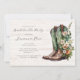 Célébrez avec un thème rustique de bachelorette champêtre avec des bottes de cowgirl fleuries aquarelle sur fond de bois blanc. Parfait pour les épouses qui marient charme décontracté et style occidental, ce design apporte une ambiance de terroir à votre célébration. Disponible sous forme d'invitations imprimées, de téléchargements numériques ou les deux.