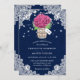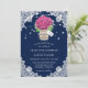Invitations de mariage rustique bleu marine et rose avec hydrangée et bouquet d'haleine de bébé à l'intérieur d'un bocal de maçon sur un burlap et arrière - plan de dentelle fleurie. Un design de carte parfait pour inviter vos invités à votre fête de mariage campagnard rustique bleu marine et rose inspirée des fleurs d'hydrangée. Carte facile à personnaliser.