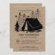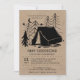 Invitation camping rustique entièrement modifiable - parfait pour les enfants, les adolescents et les ados anniversaire, campings, randonnées et thèmes barbecue. Le dessin a une silhouette de gribouillage d'une tente de camping dans une forêt boisée de pins, sous la lune et les étoiles. Il est écrit en police de caractères vintage de machine à écrire et en majuscules sur un arrière - plan de papier kraft look texture.