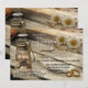 Engagement party invitation in a country style with a rustic wood table with lantern, rings and daisy flowers.