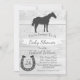 Silhouette de cheval gris et planches en bois de grange blanc design invitation baby shower. Idéal pour une élégante douche à thème rustique pour une mère à être!