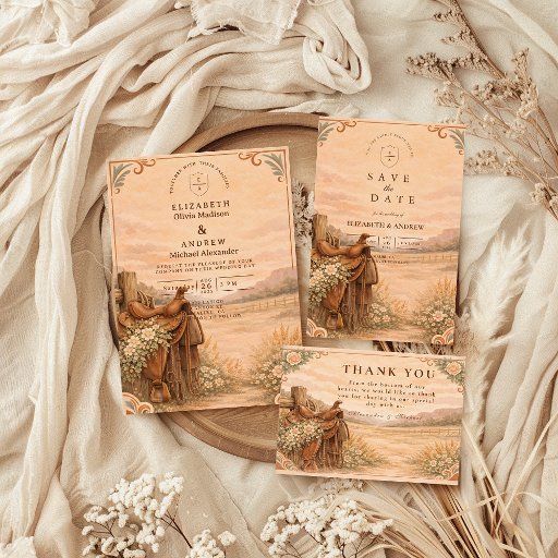 A rustic western wedding design inspired by desert landscapes, warm earth tones, and vintage botanical details. Featuring a sun-washed desert scene, wooden fencing accents, and soft florals, this invitation is perfect for ranch weddings, western celebrations, or couples planning a desert-inspired ceremony. Elegant, timeless, and fully customizable for your special day.