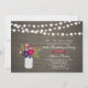 Célébrez votre journée spéciale avec cette élégante invitation d'anniversaire surprise. Ce design comprend des lampes à cordes, un bouquet de fleurs couleur d'automne avec un bocal de maçon sur un arrière - plan en bois rustique. Vous pouvez customiser le texte à n'importe quel âge ou événement.
