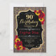 Rustique 90ème anniversaire Invitation. Design élégant avec parties scintillant en or et motif en bois brun foncé. Parfums de tournesol et rose. Idéal pour un élégant style champêtre ou une fête d'anniversaire dans le jardin.