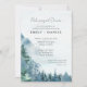 Le décor du faire-part de mariage à thème Fêtes d'aquarelle montagnes rustique répétition avec des aquarelles et des montagnes sur un arrière - plan bleu poussiéreux d'aquarelle. La typographie associe le lettrage traditionnel au texte à lettres manuscrites moderne. #WeddingInvitations #DustyBlueWedding #WeddingInvite