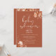 Une élégante invitation au baby shower élégante, avec une typographie élégante et de jolis feuillages botaniques rustiques sur un arrière - plan en terre cuite. Conçu par Thisisnotme©