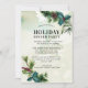 Choix élégant et chic pour un dîner de vacances avec arrangements saints et à feuillage persistant sur un doux lave à l'aquarelle de bienvenue. Les cônes de pin et les baies ajoutent à la joie des fêtes. Le dîner de vacances est écrit en gros caractères. Les détails de la fête du dîner sont écrits dans un script plus petit. L'emplacement est écrit dans un texte en gras facile à lire.