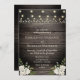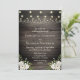 Invitation vos invités à la ferme mariage de vos rêves. Vieux, arrière - plan en bois de barbier foncé avec des lumières suspendues contrastées au-dessus, et d'anciens bouquets fleuris blancs en bas à gauche et à droite.