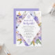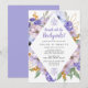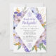 Des fleurs élégantes violettes et bleues créent un cadre en forme de diamant pour entourer vos détails de brunch d'après-mariage.