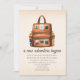 Baby shower à thème aventure avec illustration d'un sac à dos en cuir marron orné de nature sauvage, de camping, et de patchs à thème randonnées avec deux biberons sur les côtés.