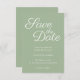 Le texte de la typographie Save the Date est un beau style contemporain élégant de calligraphie en blanc contre sage solide. Ajoutez votre propre photo de fiançailles à l'arrière si vous le souhaitez. Customisez la couleur verte de l'arrière - plan pour correspondre à votre palette de couleurs mariage. Cet élégant mariage de calligraphie, sauf l'invitation à la date, se trouve sur une variété d'arrière - plans décoratifs.