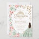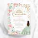 Sage Green, rose vif et blanc, florale dorée Quinceanera invitation à la célébration. En vedette brune fille en robe de robe de bal, police de script, papillons d'or, rose et tiara. Parfait pour une élégante célébration de glamour de style princesse. Personnalisez avec vos propres détails. Invitations Zazzle imprimées ou téléchargement instantané modèle imprimable numérique.