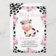 Invitation de Saint Vache Florale 1er Anniversaire. Petite invitation de premier anniversaire à la vache à thème pour une petite fille avec une jolie vache noire et blanche, un motif d'impression de vache aquarelle et de belles arrangements floraux roses