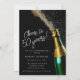 Parfait 50ème anniversaire d'invitation pour un homme ou une femme. Une bouteille de champagne ouverte avec des bulles d'évasion crée un design festif. Le "Cheers to 50 years" est écrit dans un script moderne et tendance. Les détails de l'anniversaire suivent ci-dessous. Le texte blanc apparaît contre l'arrière - plan noir. Tout le texte peut être édité afin que vous puissiez vraiment concevoir une expérience personnalisée pour vos invités.