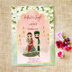 Sangeet mehndi faire-part de mariage indien modèle. Mignonne mariée indienne en vêtements mariages vert et marron, guirlandes de jasmin, arrière - plan vert et rose.