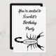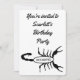 Cette formidable Invitation de fête d'anniversaire présente une image art numérique d'un scorpion noir avec de grandes griffes et une grande piqûre sur la queue courbée au-dessus du haut de son corps, avec le mot Scorpio en texte noir gras dans le corps de l'arachnid. Un design amusant pour les gens célébrant un anniversaire né entre le 24 octobre et le 21 novembre sous le signe étoilé de Scorpio. Il y a du texte personnalisé à l'avant et à l'arrière vous permettant de personnaliser cet invitation avec tous les détails de la fête.