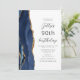 Le bord gauche de cette élégante invitation à la fête d'anniversaire moderne comporte une bordure en aquarelle bleu marine ornée d'une fausse parties scintillant dorée. Le texte personnalisable combine un script couleur or et des polices sans serif sur un arrière - plan blanc. L'envers est assorti d'un design d'agate bleu et or.