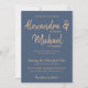 Faire-part de mariage de typographie élégante et tendance en bleu nuit foncé avec lettrage main or rose avec script de calligraphie des prénoms de la mariée et du marié. À l'arrière, il y a un faux film de cuivre métallique. — Veuillez noter que la couleur de l'arrière - plan de la marine sur le côté avant est modifiable. Vous pouvez le modifier après avoir sélectionné l'option CUSTOMISER plus loin. — L'invitation est adaptée à toute saison - printemps, été, automne, hiver - réception de mariage intérieure.