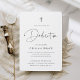 Invités Invitations pour célébrer le dévouement de votre petit avec ces invitations modernes et minimes en noir et blanc classique. Caractéristiques de conception simple "Dedication" en écriture manuscrite décontractée, avec vos détails de cérémonie et de célébration sous en lettres modernes douces noir cendre. Une petite croix moderne complète le design.