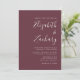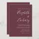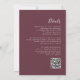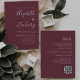 Ce faire-part de mariage moderne simple présente du texte blanc sur un arrière - plan bordeaux. Ajoutez les noms de la mariée et du marié en calligraphie stylisée et les détails en police sans serif. L'envers offre de l'espace pour les détails du mariage, ainsi qu'un code QR que les clients peuvent scanner pour visiter votre site Web et RSVP, ce qui permet d'économiser le coût d'impression et d'envoi de RSVP séparés.