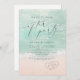 Beau turquoise abstraite aquarelle scintillante vague d'océan et les coeurs dans l'arrière - plan de plage de sable, surmonté d'un script élégant et d'élégante police serif, moderne et simple. Grand bonheur jamais après une invitation à la fête pour le mariage nautique plage, mariage de destination tropicale, mariage sur le thème de l'océan côtier en été.