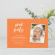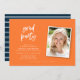 Élégante invitation de remise de diplômes photo avec votre photo dans une bordure blanche et "Grad Party" en écriture branchée contre un arrière - plan orange sur le devant et un motif à rayures bleues et blanches sur le dos. Personnalisez-le en remplaçant le texte de l'espace réservé et en remplaçant l'exemple/l'espace réservé par votre propre photo. Pour plus d'options comme changer la police et sa taille/couleur ou l'espacement entre les lettres cliquez sur le bouton "Personnaliser". *Veuillez noter que le filigrane Zazzle qui apparaît dans l'aperçu du zoom n'apparaîtra PAS sur le produit imprimé final. © Bois de rose et agrumes