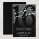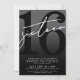 Invitation pour une fête d'anniversaire de seize ans gris foncé et noir. Célébrez vos seize ans avec style grâce à ce design audacieux et chic. La moitié supérieure présente un grand « 16 » noir avec un texte manuscrit blanc « sixteen » impertinent en surimpression, qui se détache sur un fond gris foncé pour une esthétique générale noir et blanc. La partie inférieure est en gris foncé uni avec les détails de la fête dans une police blanche sans empattement pour un look moderne et saisissant. Les couleurs sont entièrement personnalisables.