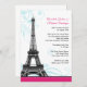 Cartes d'invitation : Élégantes et modernes invitations de réception de mariage parisien avec une tour Eiffel en nuances de gris sur un fond rose fuchsia avec des fioritures bleu aqua derrière.