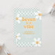 Sept est une invitation d'anniversaire Groovy Girl rétro inspirée avec des polices de caractères des années 70, des marguerites et un motif à carreaux.