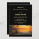 Une invitation à la retraite en noir et or avec l'image d'un bateau face au coucher du soleil.