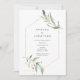 Aquarelle faire-part de mariage de verdure fleurie dans les tons pastel avec cadre géométrique doré personnalisable selon vos spécificités d'événement.