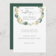 Des feuilles rustiques d'aquarelle vert et or courent des invitations de mariage avec des fleurs blanches avec un texte calligraphique élégant mélangé avec une police moderne. Le modèle est facile à personnaliser avec vos propres informations. Le dos de la carte est foncé, vert, qui correspond aux feuilles de la couronne.