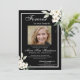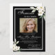 Cette invitation présente une élégante verdure de fleurs blanches et encadre sur un arrière - plan noir avec la photo de l'aimé disparu au centre. Il vous suffit de personnaliser l'invitation et de remplacer la photo de votre proche et les informations concernant les funérailles/service commémoratif. Vous pouvez customiser l'invitation à n'importe quelle façon que vous voudriez se souvenir et honorer la mémoire de votre être cher. Remarque : "Pour toujours dans nos coeurs", la verdure des fleurs blanches d'aquarelle avec cadre et autres éléments graphiques et d'oeuvres d'art ne peut pas être modifiée, modifiée, supprimée ou déplacée. Elles sont réparées.