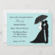 Un couple chic qui prend une invitation avec la mariée et la silhouette du marié sur un arrière - plan bleu. La mariée tient un parapluie floral.