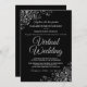 Ce n'est pas parce que vous avez été forcé de déplacer votre mariage vers une cérémonie virtuelle que vous ne pouvez pas envoyer de belles invitations. Cet élégant invitation présente un script gris pâle élégant en lettrage sur un arrière - plan noir avec un faux fil argenté floral en dentelle ou des boucles et tourbillons dans les coins. Un moyen parfait d'invitation vos amis et votre famille pour partager votre journée spéciale, même s'ils ne peuvent pas être là en personne.