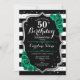 Invitation à la fête du 50e anniversaire. Elégant design floral vert émeraude avec faux parties scintillant argent et rose. Fonctionne avec des rayures noir et blanc et une police de script. Idéal pour une célébration anniversaire féminine élégante. Peut être customisé pour n'importe quel âge ! Invitations Zazzle imprimées ou téléchargement instantané modèle imprimable numérique.