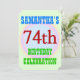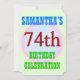 Ce design amusant d’invitation de fête d’anniversaire comporte un message comme "74e anniversaire de SAMANTHA", où le nom et le numéro d’anniversaire peuvent être personnalisés. Il dispose également d'un arrière - plan amusant et multicolore. Les détails de l'événement sur le dos peuvent être customisés. Il pourrait être utilisé pour les invitations à la soixante-quatorzième fête d’anniversaire ou à la fête d’anniversaire de quelqu’un. [~Z0000311]