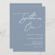 Le design propose un script fantaisiste décontracté avec une citation "Ensemble comme un". Faire-part de mariage bleu clair et poussiéreux.
