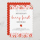 Adorable et simple invitation de premier anniversaire de baie avec un bord de pétoncle et un motif de fraises coupé en deux, montrant un coeur rose. Un design très audacieux pour une fête amusante. Cette invitation a été illustrée et conçue par Patricia Alvarez.