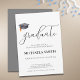 Invitation de graduation simple et moderne avec une illustration d'une casquette noire de graduation et d'une typographie élégante. Illustré et dessiné par Patricia Alvarez.