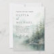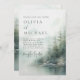Featuring a soft watercolor pine forest reflected in tranquil waters beneath a misty mountain backdrop, this design sets the tone for an elegant, nature-inspired wedding.
