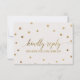 Cette carte de réponse RSVP de site web de mariage à pois dorés est parfaite pour un mariage élégant. Le design simple présente de jolis confettis dorés sur un fond champagne crémeux avec une belle calligraphie en faux feuillet doré. Personnalisez la carte de réponse en ligne avec votre date limite de réponse et l'adresse de votre site web de mariage. Si vos invités n'ont pas besoin de mot de passe pour le site web, vous pouvez remplacer le texte par un message court et doux pour vos invités ou une méthode alternative de réponse.