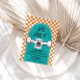 Skateboard Let's Kick It, invitation d'anniversaire avec chèque orange et skateboard bleu.